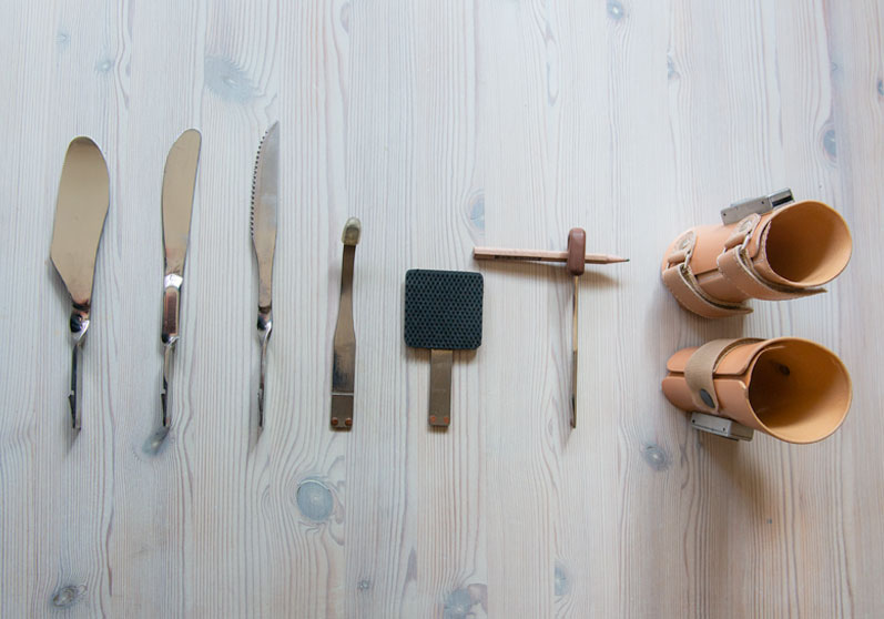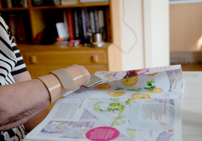 Håndledsmanchetten sættes på armen ved håndleddet. På manchetten monterer du forskellige redskaber. Det kan for eksempel være en kniv, en kartoffelskræller, en blyantholder eller redskaber fremstillet til andre individuelle funktioner. Redskaberne kan skiftes ud i forhold til dine daglige behov.